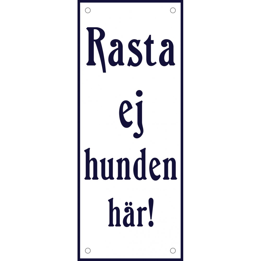Emaljskylt Rasta ej hunden här! vit - blå 8 x 20 cm modell 47-5